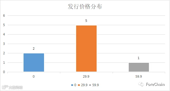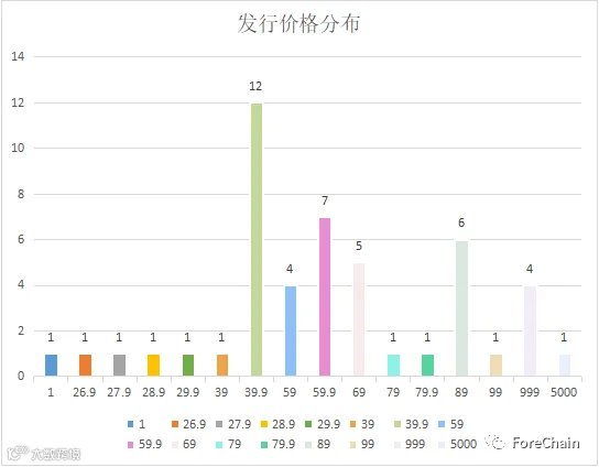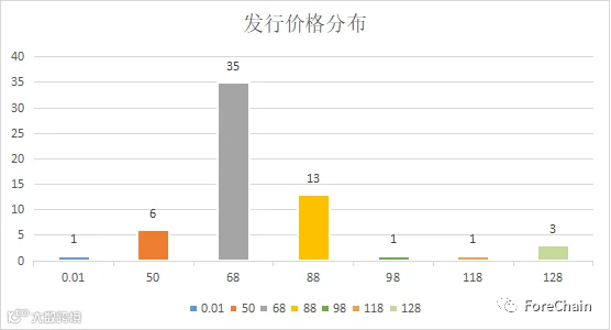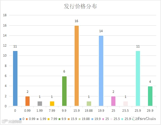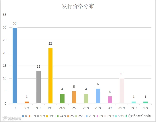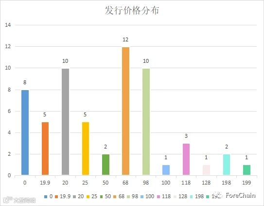 从平台内提供的数据来看,平台中有30%的数字藏品为免费赠送,其余的发行价格也在百元以下。根据目前收集到的数据,平台共销售了104,606个数字藏品,共计221,1767.9元,其中有37款数字藏品售罄。(数据来源:ForeChain NFT Database)