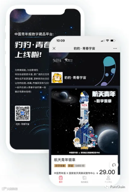 豹豹·青春宇宙的官方定位是官方优质文化产品的发行平台,青年人创新、创造、创效的平台,于今年6月上线。平台授权由中国青年网具体运营,以树图链为技术底座,储备了空投、拼图、盲盒、预售、转赠等主流玩法及功能,该平台的首款数字藏品“航天青年数字徽章”由中国青年报社和国家航天局新闻宣传中心联合推出。