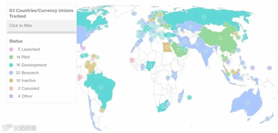 而在中国之外,据 Atlantic Council 统计数据,全球目前已有 5 个国家全面推出央行数字货币。