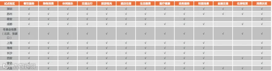 可以看出,各试点地区均覆盖了餐饮服务、购物消费、休闲娱乐、旅游观光、交通出行、酒店住宿、生活缴费、政务服务及消费扶贫等9大场景,其中,餐饮服务、购物消费和休闲娱乐是主要的线下应用场景。