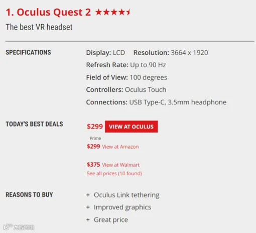 2020 年 10 月,Oculus 发布了 Oculus Quest 2,售价299美元。该产品一经推出,就收获了许多的好评。除了其相对非常亲民的价格之外,软硬件的升级,顺畅的画质以及非常少的眩晕感都成为其卖点。许多VR/AR设备网站都将Oculus Quest 2列为如今VR/AR设备的第一名。