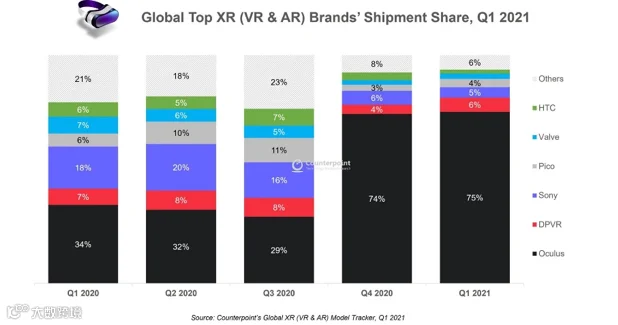 而Oculus Quest 2的推出也帮助Meta公司占据了75%以上的市场份额(2021年第一季度的出货量)。