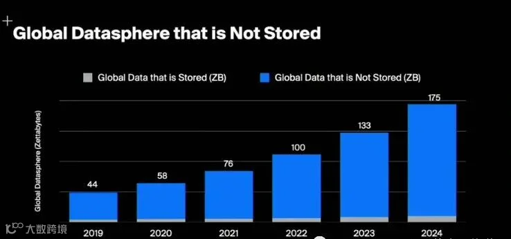 4、我们每年产生大约58ZB的信息,到2024年,这一数字将增长大约3倍,达到175ZB。但这不是我想关注的关键统计数据。目前存储的总数据量的5%左右的数据。有大量的新闻案例表明,真正有价值的数据正在被丢弃。它没有被积极存储。