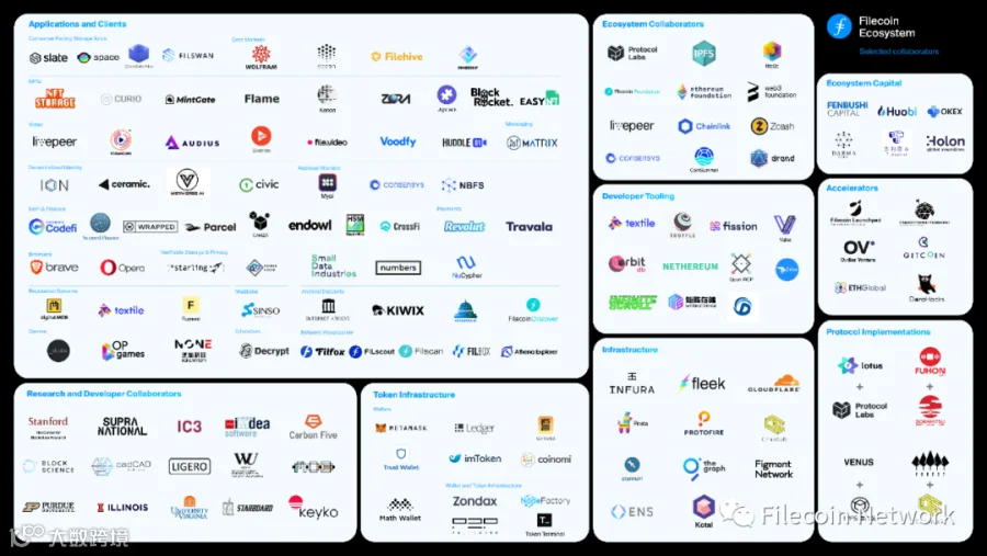 整体看,这个生态展现出了显著增长,如与应用程序和客户端的整合、开发者工具和基础设施。最近,生态工作组将简化终端用户和开发者与Filecoin互动的工作排上优先级。这带来了如Textile Powergate、Estuary和NFT.Storage等服务的开发。Filecoin生态的所有使用场景可以在这里(https://ecosystem.filecoin.io/)查看。一部分生态参与者的图表也在下面展示了。