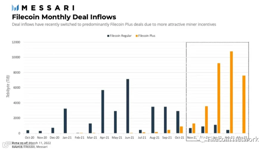 存储交易协议的输入数据从2020年10月的400 TiB增加到2022年3月的7600 TiB以上,而Filecoin Plus显然对这个增长有贡献。从2021年第四季度起,有一个趋势,就是未验证的数据(Filecoin常规存储交易协议的输入数据) 转换为由Filecoin Plus验证过的存储协议主导的数据输入。