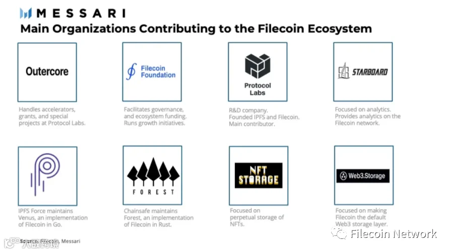 Filecoin获得了几家组织的积极支持,它们的共同目标是发展Filecoin生态。这些组织联合成立了生态工作组(Ecosystem Working Group)。这个工作组参与者的责任包括维护和升级底层协议、支持生态成长及协助治理。这个工作组里最知名的成员包括协议实验室、Filecoin基金会和Outercore。下图展示了主要的参与机构。