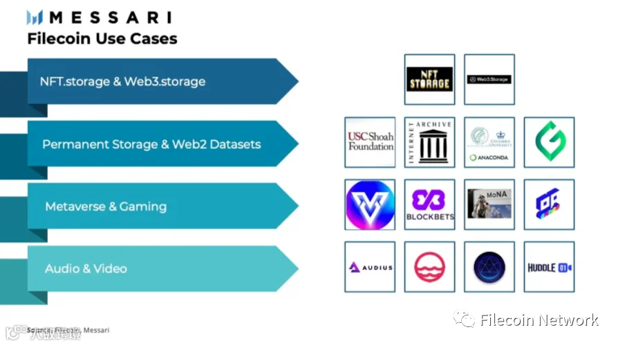 Filecoin生态很庞大,正急剧扩展,并将自己定位为分布式网络的支柱。随着云存储需求的增加,Filecoin提供了替代流行的中心化平台的方案。现在已经出现了不同的额外使用场景,而还有新的将会在不久的未来实现。有四类使用场景已经有很高需求了:(1) NFT和Web3存储,(2) 永续存储和Web2数据集, (3) 元宇宙和游戏,(4) 音视频。