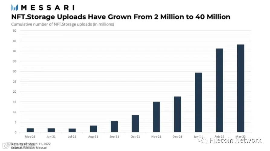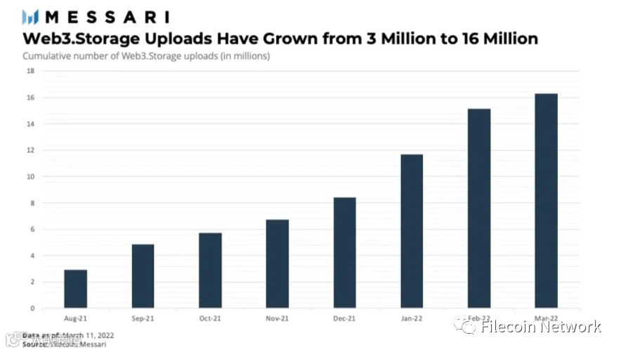 Web3.Storage使用冗余机制,在多个Filecoin存储提供者和全球分布的IPFS节点之间存储数据。这些IPFS节点是由Web3.Storage团队运行的。此外,这些服务无限期提供无限制的存储空间。这是由Filecoin Plus的经济机制促成的。总的来说,Web3.Storage自发布后经历了稳定增长,从2021年8月的300万个上传项目增长到2022年3月的1500万个上传项目。