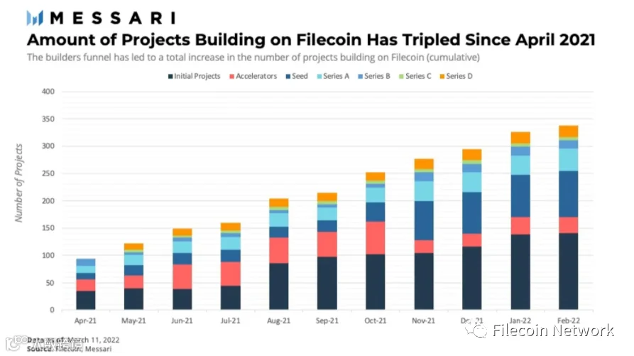 这些组织一直积极通过黑客松、加速器、资助(Grant)计划、导师计划和增长支持,来搭建开发者和创建者通道。这个通道旨在帮助早期项目和团队发展,以到达融资阶段。这样,有超过330个项目正在Filecoin和IPFS上搭建。下面是这个通道的细节,展示了项目的演进过程,并以其成熟阶段分组。
