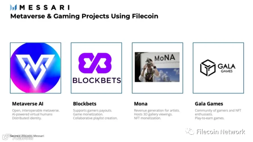 新一代的元宇宙和游戏使用场景正利用Filecoin和IPFS技术。这些使用场景的底层逻辑是用户的变现。在这个领域里,Blockbets(https://blast.gg/)和Gala Games(https://app.gala.games/)支持游戏玩家产生收入,向他们支付费用。涉及到艺术家变现时,Mona(https://www.mona.gallery/)支持艺术家们将自己的高端作品在虚拟空间展示,并售卖给收藏家。Metaverse AI(https://www.metaverseai.org/)将人类互动带到了下一个层次:它让游戏玩家与游戏里的其他AI驱动的虚拟人类进行游戏,并通过互动变现。