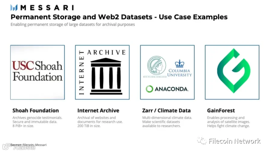 Shoah Foundation(https://sfi.usc.edu/)在存档幸存者证言方面是一个重要的项目。当涉及到大型公共数据集时,就需要提到互联网档案馆项目(https://archive.org/)使用Filecoin来存储网站和文档给公众访问。此外,Zarr和GainForest存储了大型的公共数据集,目标是预防气候变化带来的自然灾害。Zarr项目(https://github.com/zarr-developers)让很大范围内的研究人员都能获得气候数据来进行分析。而GainForest(https://www.gainforest.app/)利用卫星照片来对抗气候变化的影响。