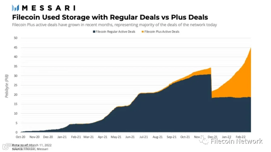 网络上被使用的存储容量(如活跃的存储交易协议)从2020年10月的0.25 PiB (1 PiB = 1024 TiB)稳定增长到2022年3月的45 PiB 。如下所示,有超过26 PiB的内容是产自Filecoin Plus存储交易协议,代表了网络上57%的活跃存储交易协议。