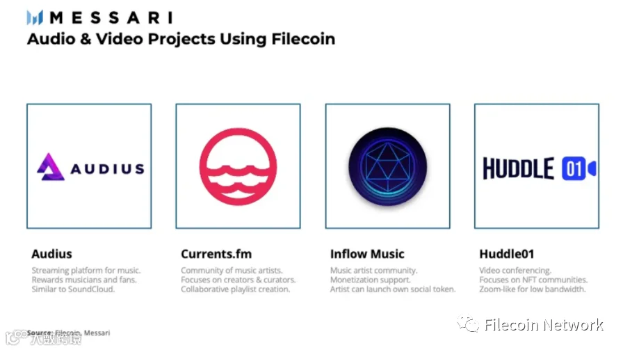 最近,几家利用了Filecoin和IPFS技术的音视频应用获得了大量关注,例如Web3版本的“Spotify或SoundCloud”。Audius(https://audius.co/)是一个音乐流媒体服务,外观和使用都像SoundCloud,但它是利用了IPFS技术的。Currents.fm(https://a.currents.fm/)和Inflow Music(https://www.inflowmusic.io/)为音乐创造者和策展人社区提供支持。Huddle01(https://huddle01.com/)可能会成为下一个Zoom,它是一个低带宽的视频会议平台,为远程会议的需要进行定制,专注于NFT社区。