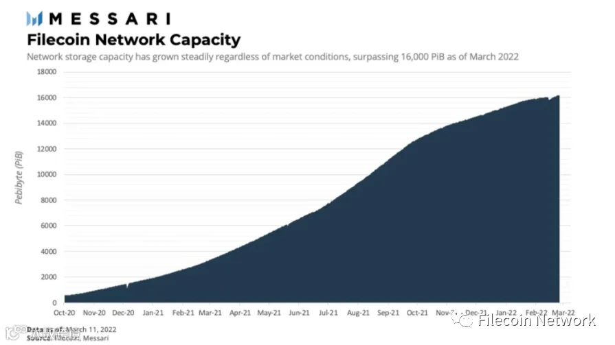 得益于其开放市场策略和激励机制,Filecoin吸引了显著的存储容量。不管市场状况怎么变化,Filecoin网络里投入的存储容量从2020年起稳定增长到16,000 PiB,相当于截至2022年3月的65,000份维基百科的副本或1,600份Netflix 电影存档。这个网络的容量来自分布全球的3900个存储提供者。