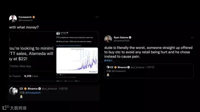 现在,FTX 和 Alameda 不仅需要支付用户提款,还要部署资本捍卫 FTT 的价值,Alameda 的相关钱包地址也开始频频从各大交易所转移资产进入 FTX。与此同时,CZ 却在火上浇油,在一条质疑 Alameda 22 美元回购承诺的推文下回复了一个耸肩