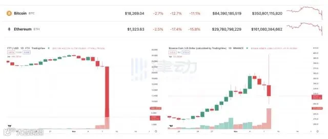 突然间,市场情绪来了个 180 度大转变,立马从急涨转为急跌,FTT 直接开启清算模式,价格瞬间来到个位数。BTC、ETH 无一不受到影响,砸穿了横盘数日的价格。就连 Web2 世界的 Robinhood 也受到了牵连,由于 SBF 持有 Robinhood 5600 万股,为 第三大股东,Robinhood 股价下跌了 18.83%。