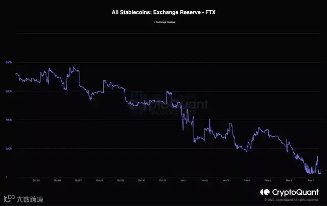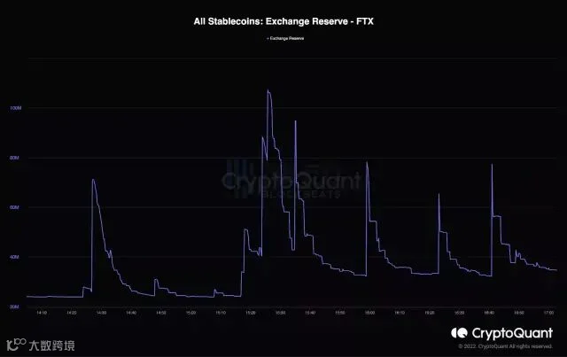 。然而 SBF 的回应没有起到太大的作用,平台上仍有大量客户在转出资金,FTX 上的稳定币更是在迅速枯竭,甚至刚进入平台的稳定币也几乎是立刻耗尽(图二、图三)。