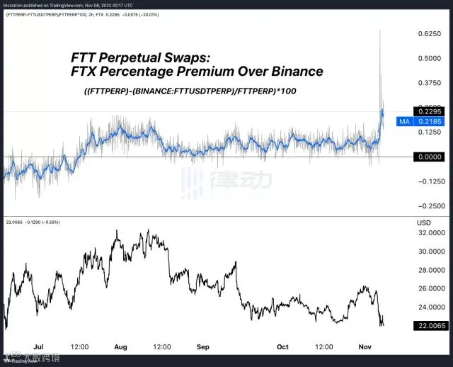 随着恐慌情绪堆积,大量投机者开始通过合约市场涌入,数小时内,FTTUSDT 永续合约在 Binance 上的交易量从 2000 万美元激增至 4000 万美元附近,多空争夺激烈。而 Alameda 也试图捍卫 FTT,Token 价格在 FTX 与 Binance 之间的汇差也推至历史高位。几轮拉锯过后,FTT 还是跌破了 22 美元关口,一路下滑至 15 美元附近。