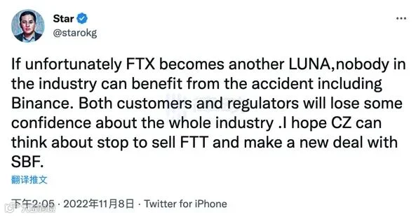 在社交媒体上发文表示:「如果 FTX 不幸成为另一个 LUNA,那么包括 Binance 在内,没有人能从这次事故中受益。客户和监管机构都会对整个行业失去一些信心。我希望 CZ 可以考虑停止出售 FTT,与 SBF 达成新的协议。」