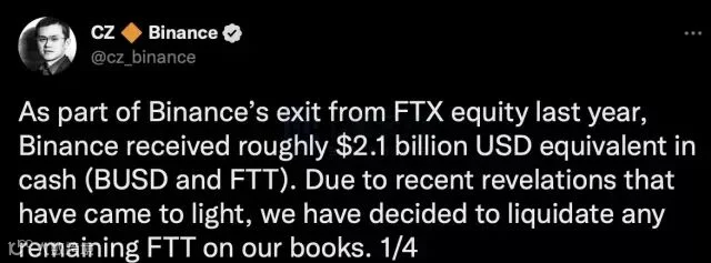 发文,表示 Binance 去年退出 FTX 股权后,收到了大约 21 亿美元等值的现金(由 BUSD 和 FTT 组成)。由于最近曝光的消息,