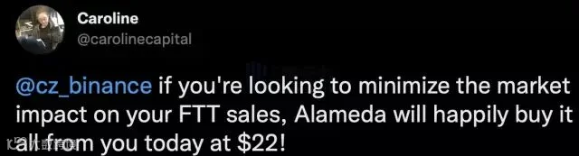 在社交媒体上回应「Binance 清仓 FTT」,她表示如果 Binance 创始人 CZ 想让清仓对二级市场的影响降到最低,Alameda 现在非常愿意以 22 美元的价格收入。推文发出后,FTT 价格回升至 22 美元。