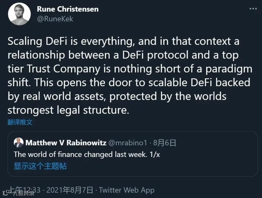 MakerDAO 创始人 Rune Christensen 在谈及现实世界资产支持的DeFi 时,就认为这是一种“范式转变”,称其为现实世界资产支持的可扩展 DeFi 敞开了大门,同时使 DeFi 受到了世界上最强大的法律结构的保护。