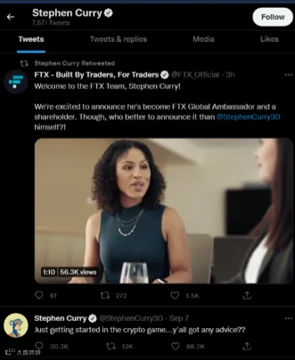 在加入FTX 之前,库里在推特发问:刚刚开始加密游戏,你们有什么建议吗?