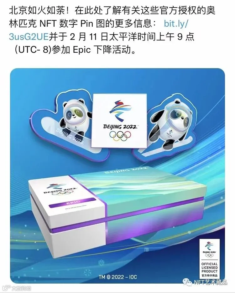 国际奥委会官方授权冰墩墩数字盲盒将于北京时间2月12日凌晨01:00在Flow链上交易市场nWayPlay发售EPIC BOX,总共500个,每个99美元,限购5个。据悉,Epic Box内将包含3个官方授权的数字胸针:1个Epic和2个Rare,其内容包括15个版本的官方授权吉祥物(冰墩墩)表演各种冬季运动,如滑雪、骷髅、单板滑雪等,5个版本的北京2022年冬奥会官方会徽和1个版本的海报。