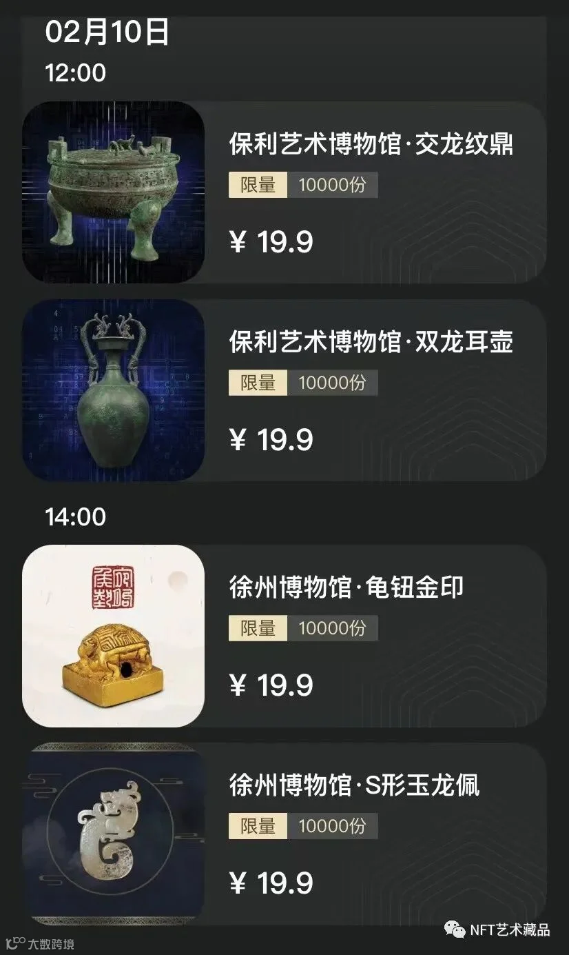 鲸探于2月10日12:00和14:00联合保利艺术博物馆和徐州博物馆发售馆藏国宝级文物《龙虎钮盖交龙纹鼎》、《双龙耳盘口壶》《“宛朐候埶”龟钮金印》《S形玉龙佩》系列3D数字藏品。本次共发行4幅作品,每幅作品各发行10000份,售价均为19.9元。