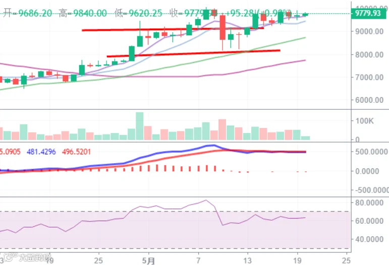 昨日BTC小幅上涨,量能较昨日变化不大,价格依旧在10000美金下方一带震荡,连续6日未能放量突破10000美金,RSI仍然在超买区域,MACD指标保持黏合状态未能显示出方向,短期内若不能放量突破10000美金压力将会出现回调。短线建议可做空单,突破10000美金止损反手做多。