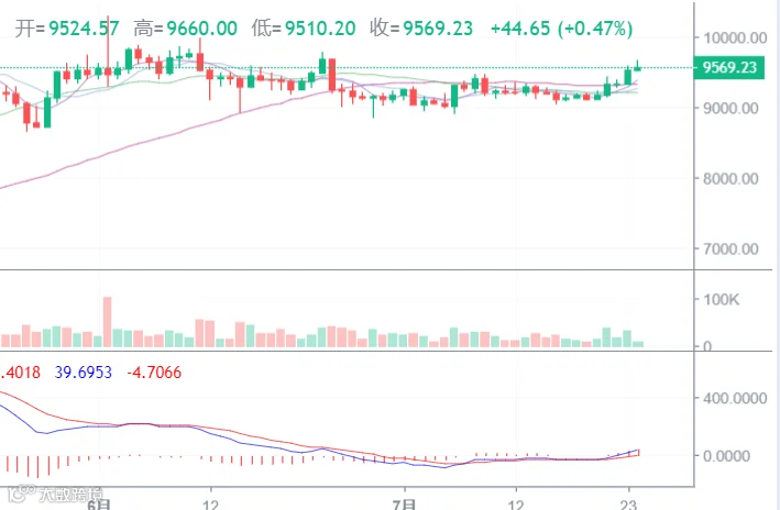 昨日价格突破9500\USDT压力,均线目前呈现多头趋势信号,MACD形成金叉,后市偏向看多,但是依然面临10000\USDT的压力,多单可继续持有,新建仓可以短多思路操作。