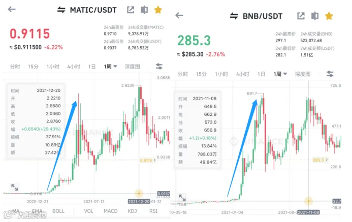 matic和币安智能链,在2021年初开启了类似的叙事故事,matic上涨超百倍和BNB上涨超过20倍。