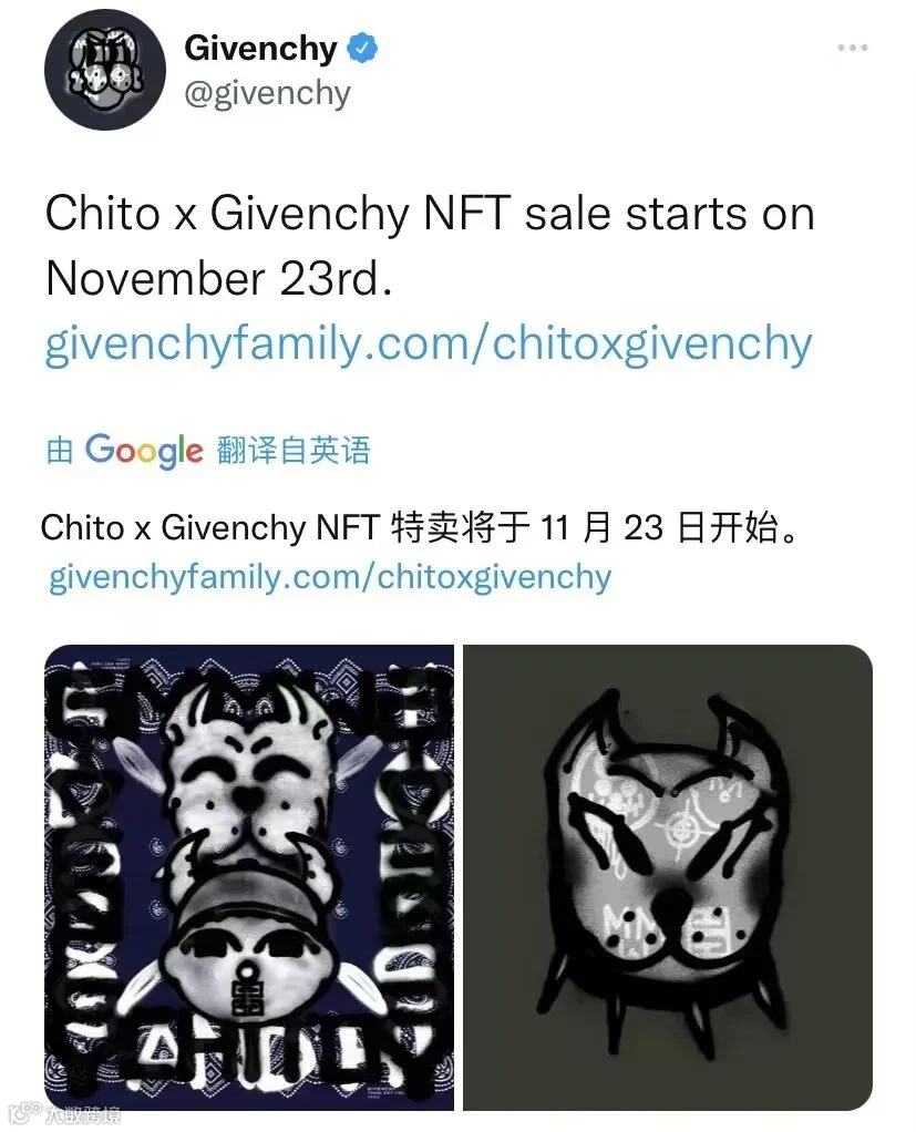 法国时装品牌纪梵希即将公开出售涂鸦艺术家Chito与Givenchy合作设计的该品牌2022年度假系列的15个NFT藏品。该系列NFT于11月23日开始在OpenSea上竞拍。