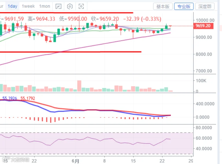 昨日小幅上涨,保持在9500/USDT上方震荡,MACD形成金叉,以及后市将冲击10000/USDT整数关口,目前继续保持向上趋势。