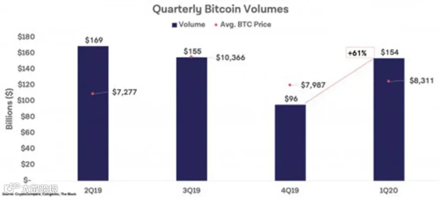 律动 BlockBeats 消息,通过对 22 家主要的交易平台交易量统计,发现 2020 年第一季度的比特币交易量大幅度增长,2020 年第一季度的交易量超 1540 亿美元,比上一个季度,也就是 2019 年第四季度的 960 亿美元增长了 61%。