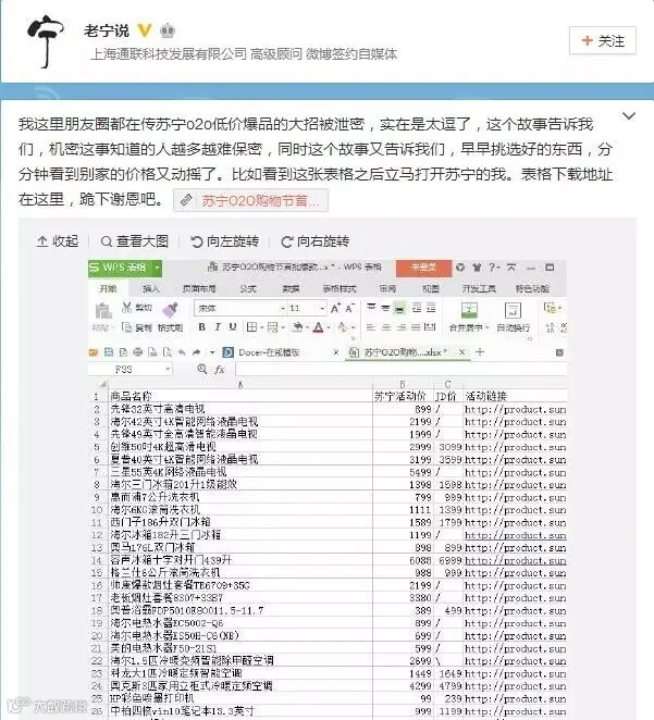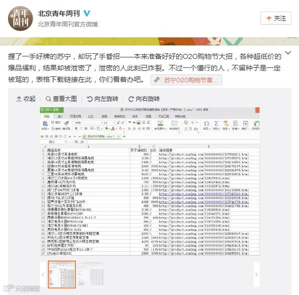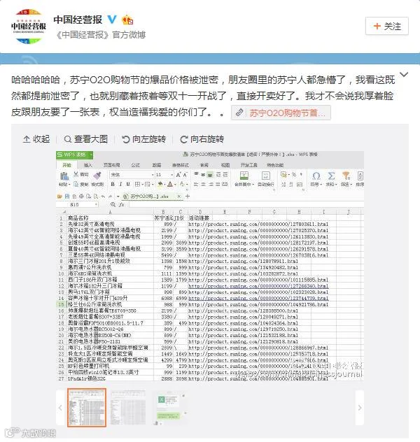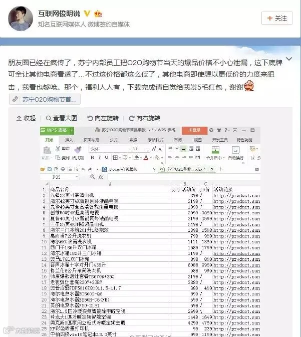 据知情人士爆料,苏宁易购迎战双十一的020购物节促销爆品价格资料,却不料意外泄密,现已在微信朋友圈、微博、以及各大论坛疯传。其明星爆品包含了远低于目前其他电商平台定价的苹果,小米等等手机品牌,包括西门子、三星、海尔、美的、老板等等知名家电品牌,均推出了爆款特价的大家电产品,无一不远低目前市场价格,这苏宁用来开战的秘密武器,一下子被对手全数知晓,企业出这么大的事故,一定是有人要到大霉了,但是,此事于苏宁是重大事故,于消费者却反而成了购物指导书。