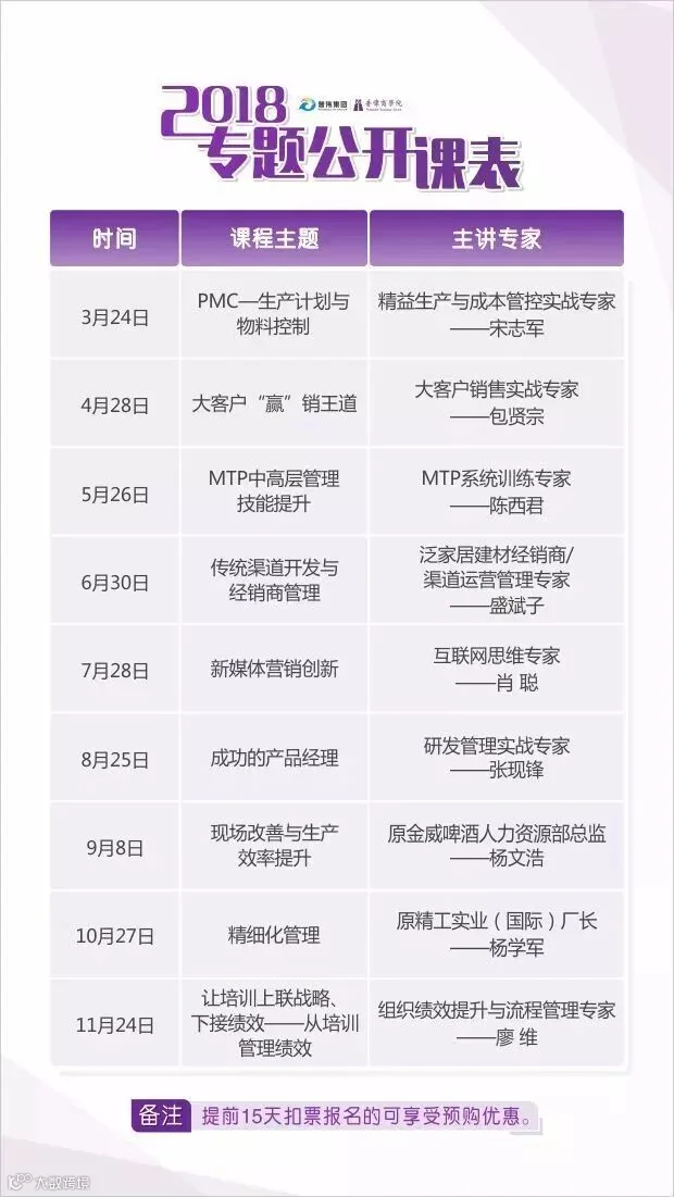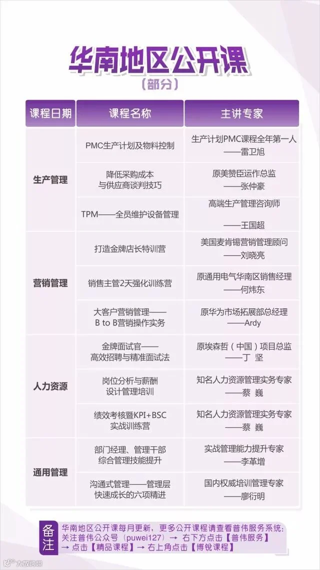 普伟商学院培训项目一直围绕建设“中国最实战的商学院”为战略方向,以“实战”为师资引进的关键标准,积极引入国内外企业运营经验丰富的顶尖师资,致力于提供优质的培训项目来提升中国企业基层、中层、高层的管理能力。目前,培训项目已逐渐成熟,主要包括普伟公开课、内训项目、华南地区公开课、企业商学院等模块,涉及生产管理、销售管理、财务管理、人力资源管理、通用管理等专业培训项目。