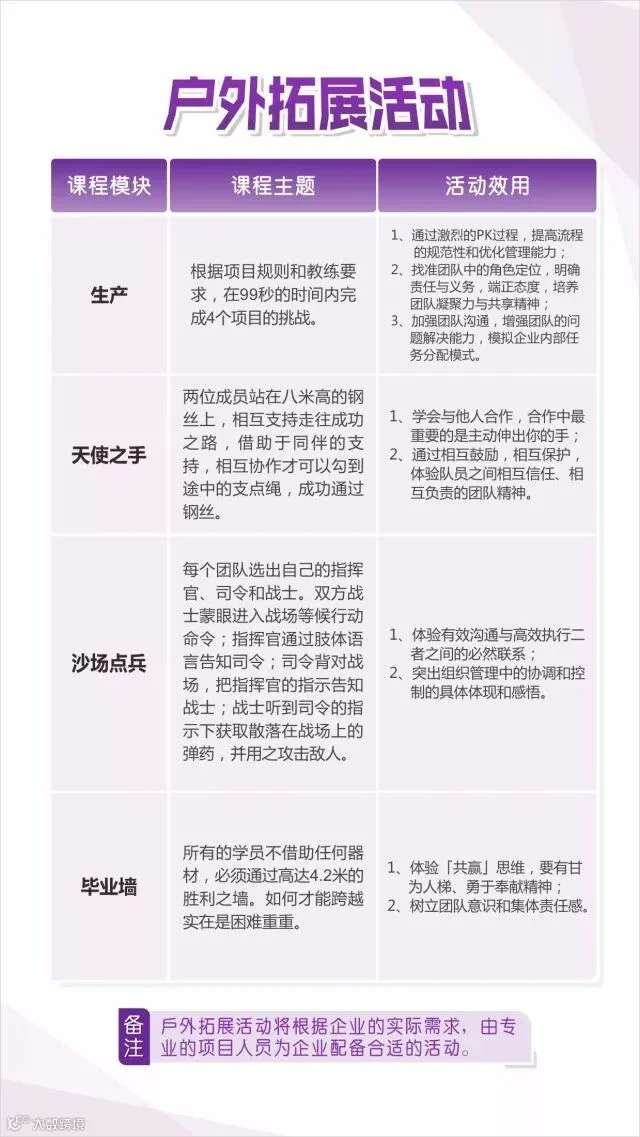 内训项目是普伟商学院秉承“持续为客户带来实用、性价比高的实效培训”的项目运营理念,从企业的培训需求出发,为企业的人才培养提升提供更有针对性、更高价值、更大灵活度的企业定制课程、户外拓展项目。