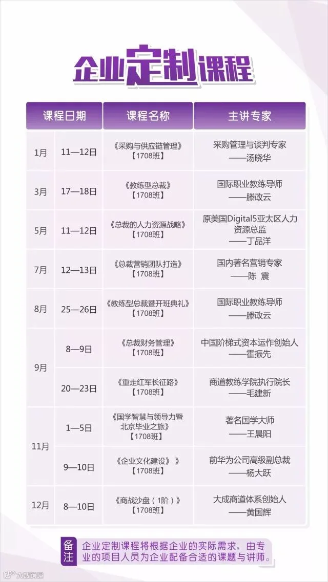 普伟商学院从企业的视角出发,为企业专门制定了精炼、实效的专题公开课。坚持选一流的师资,造一流的课程,做一流的服务,为您的企业带来最高性价比的培训体验!