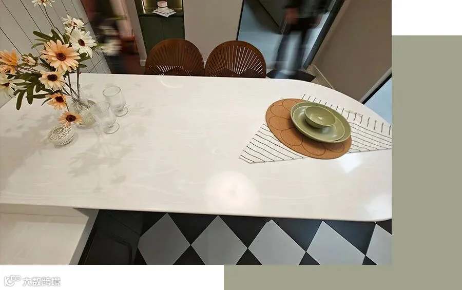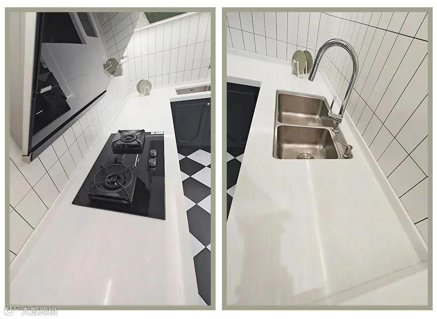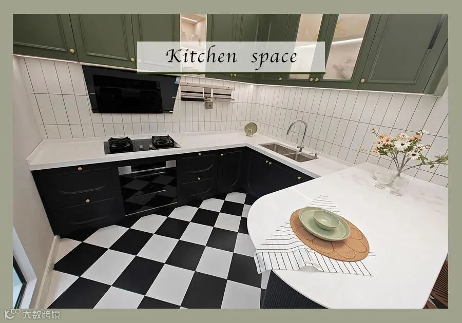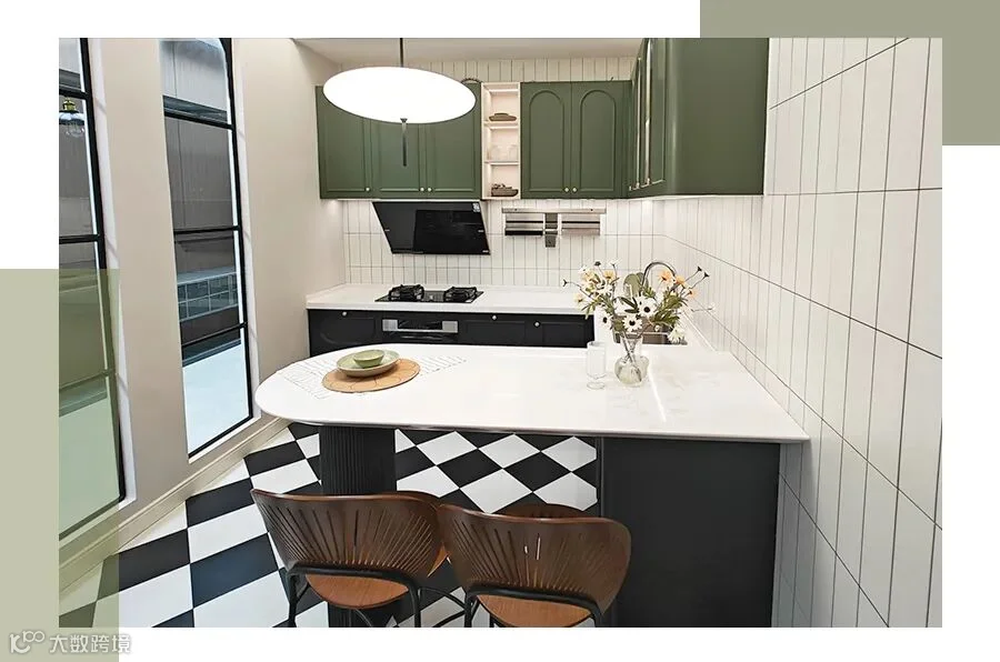 台面选用了Koris®实体面材 NW5819F 玛瑙白,橱柜采用了墨绿色和黑色,加上黑白格的地方,整体看上去很摩登高级。