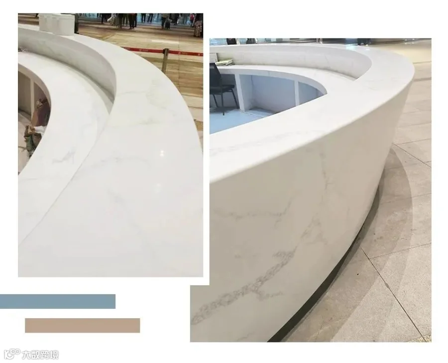 Koris®实体面材无缝拼接的特点,经过高超热成型工艺加工可实现两个平面间任意弧度的无缝拼接。