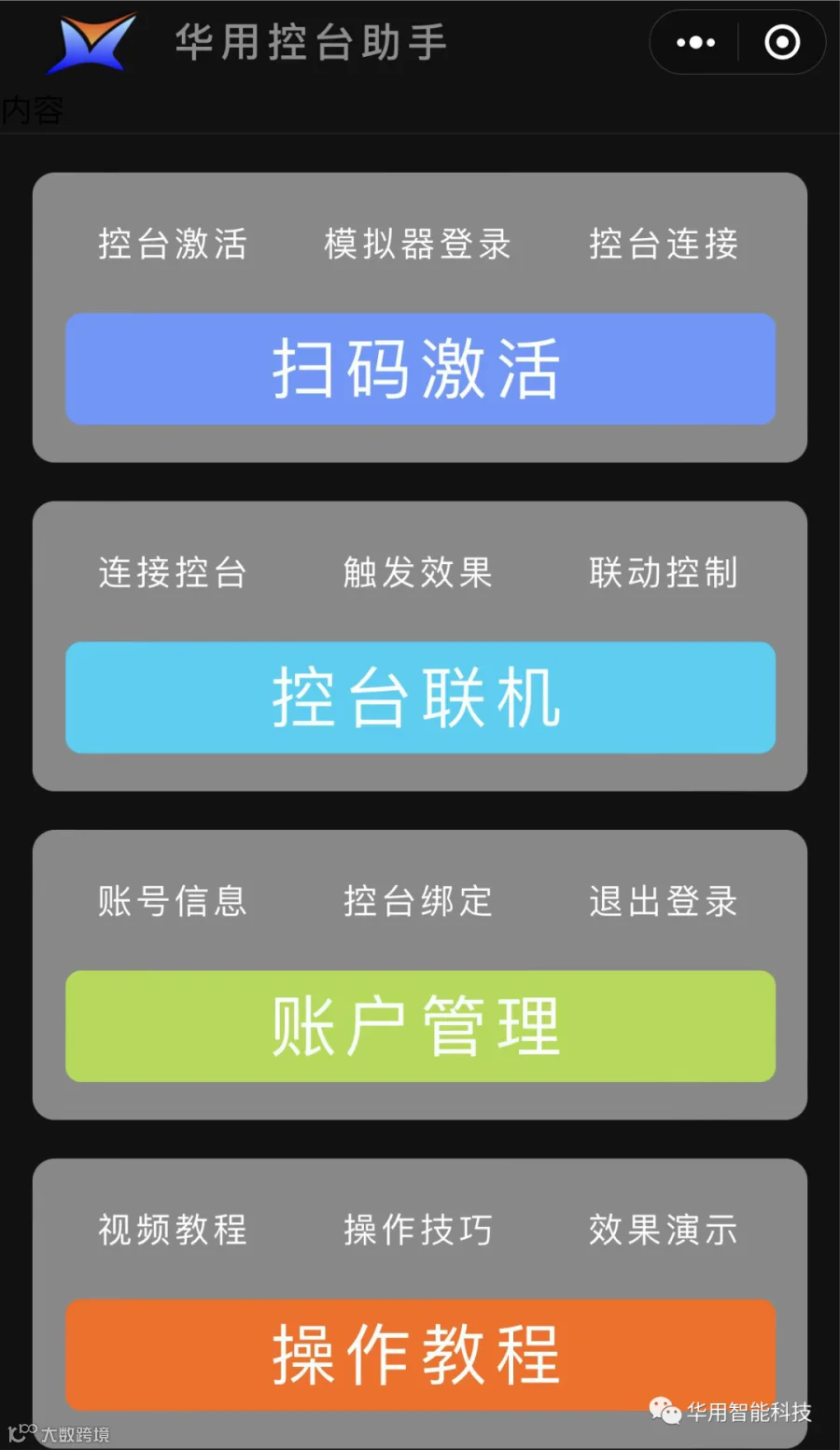 2、《华用控台助手》微信小程序只能用于升级了最新的4.1以上系统的华用控台激活和连接,低于4.1版本的控台无法使用