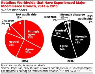 但是,到了2015年,移动电商销量增长的证据就非常明显了。强烈表示这种增长非常明显的零售商已经接近一半。从总体上看,感觉到了这种增长的零售商占到了79%。