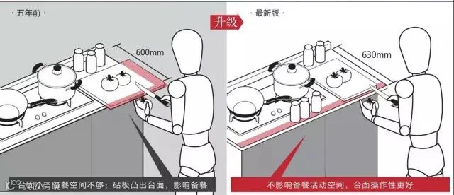 金牌厨柜联合清华大学研究院,通过专业的实验研究,重新定义了中国厨房新标准。其中一个重要的标准就是将台面深度600mm修改为630mm,柜体深度从560 mm调整为590mm。