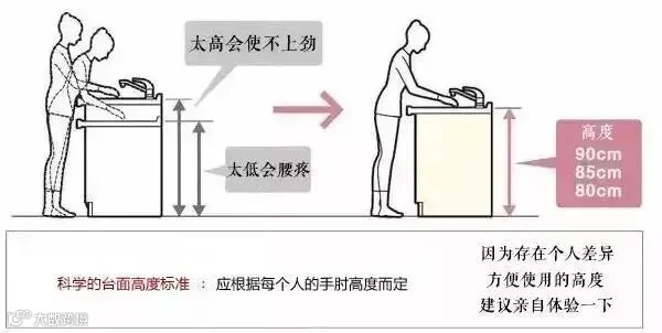 真正科学的台面设计应该要按照手肘高度,保证在台面上操作时,你的手肘处于最自然舒服的弯曲状态,合适的台面高度,避免腰酸背痛胳膊累。