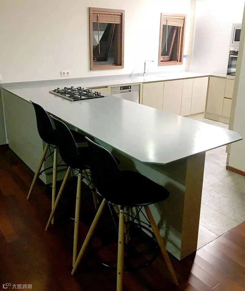厨房台面和吧台一体成型非常具有实用性。Koris®实体面材其光洁圆润质感让人舒心,转折处的弧线更是带来十分流畅、柔和的视觉感官。