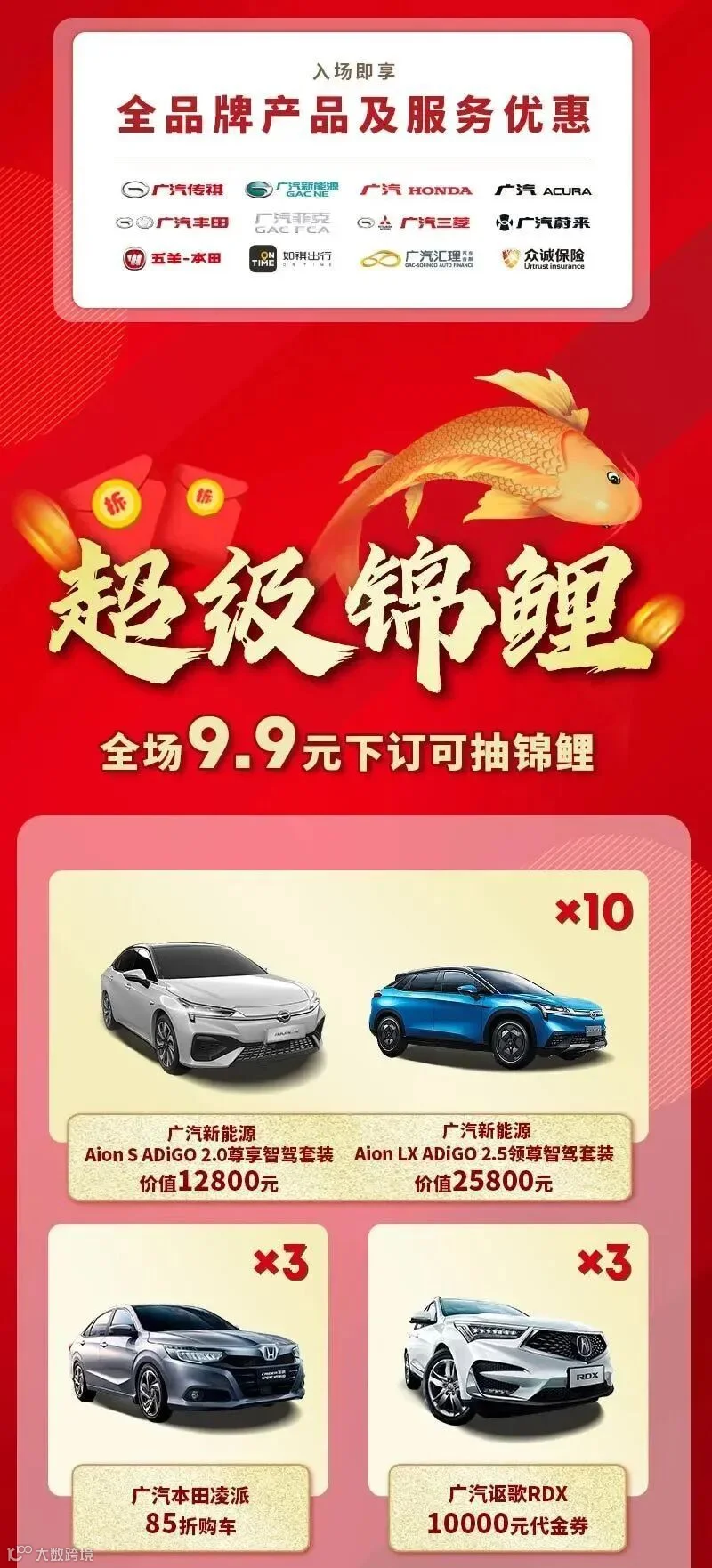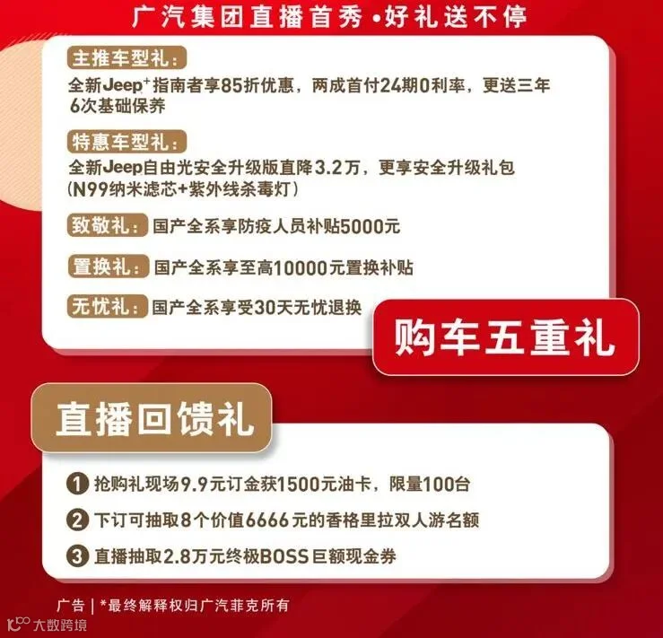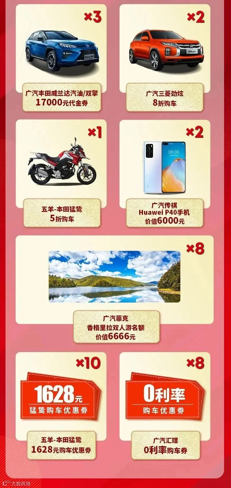 除了广汽集团送出终极BOSS券外,广汽菲克诚意助攻,推出直播回馈礼,将随机从今晚直播间9.9元下单的用户中抽取8名幸运儿,送上价值6666元香格里拉双人游名额,不仅如此,购车还可额外送油卡!在今晚的直播间下单9.9元,就有机会获1500元油卡福利,限量100张,先到先得!各种福利已准备到位,大家晚上一起来嗨!