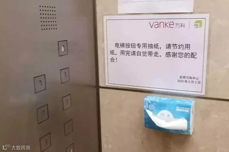 虹桥万科中心5号楼所有公共区域,由万科物业提供消毒,每天进行一次全覆盖消毒,每天四次对 所有电梯进行消毒,电梯内放置抽纸,按电梯时请使用抽纸按按钮;每两小时对电梯按钮、门把手 进行消毒;