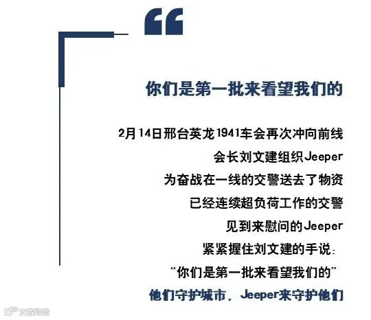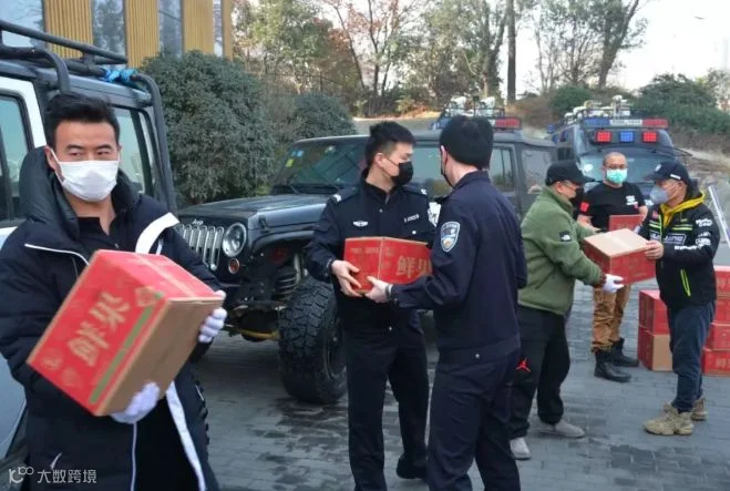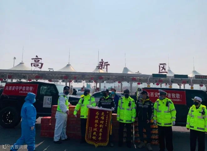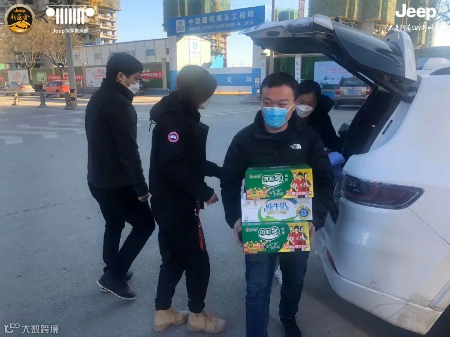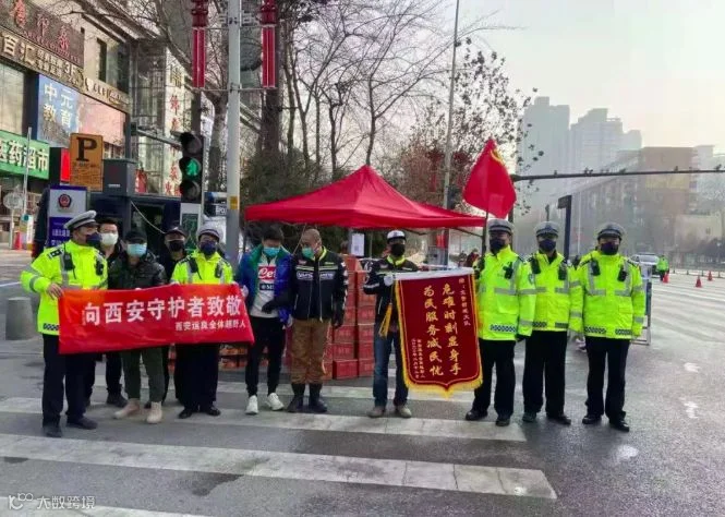 由牧马人车主职斌带领数位Jeeper,向疫情以来一直坚持在西安各个路口的民警及环卫工作者送去慰问