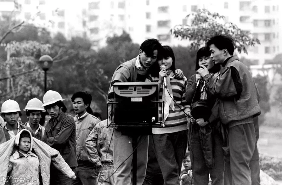 1992年元旦,深圳蛇口四海公园,民工们投入地唱免费卡拉OK